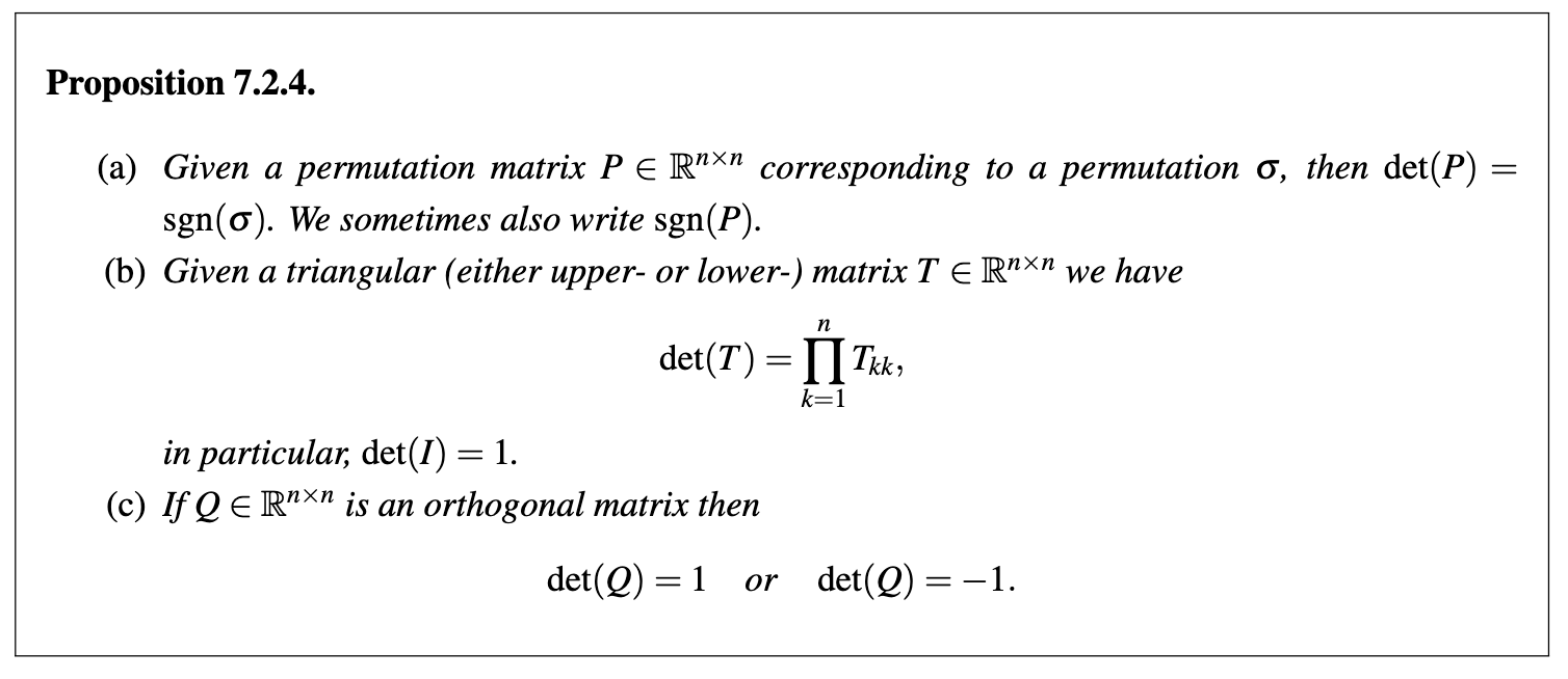- Möglichkeit, mit Gauss-Elimination in eine triangular Matrix umzustellen und dann det einfach zu berechnen. Die Determinante ändert sich nicht bei row operations, ausser beim swappen ändert sich das Vorzeichen der det.