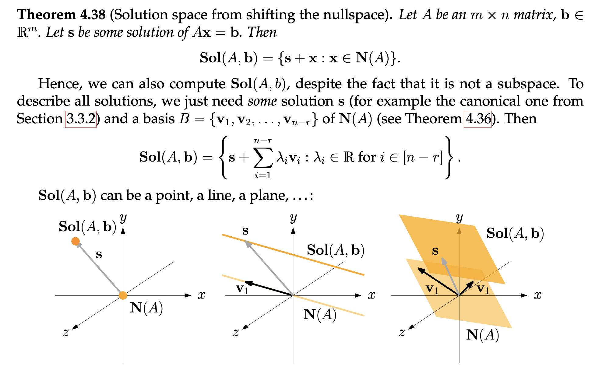 • Das heißt: Jede Lösung sieht aus wie , wobei . Wenn , ist das einfach der Nullraum selbst; wenn , ist es derselbe Raum, nur verschoben, also ein sog. shifted nullspace.